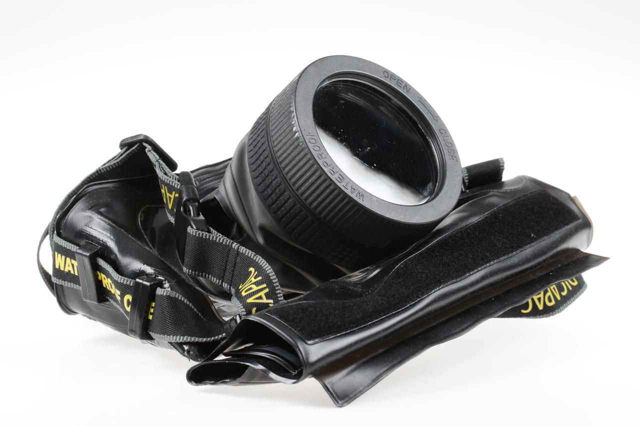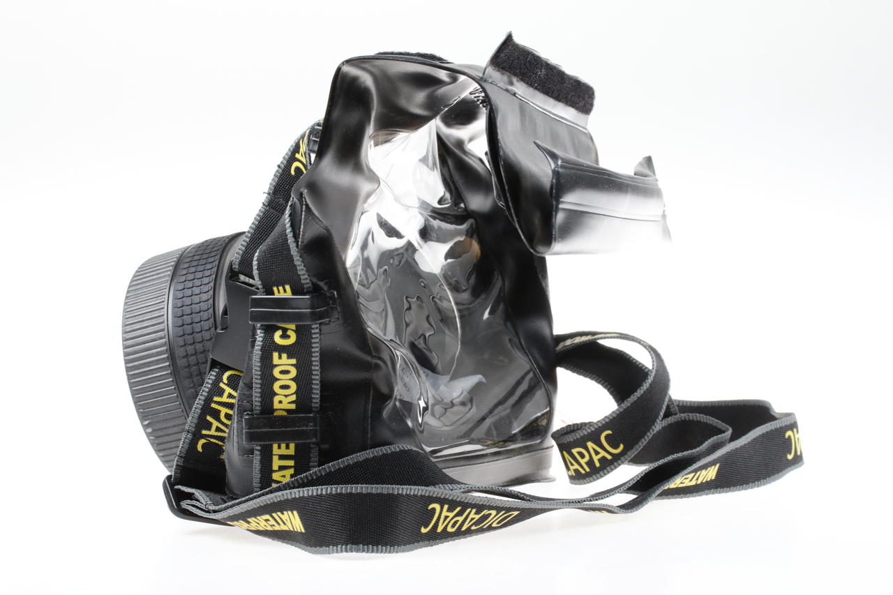 The Dicapac WP-S10 is a soft, waterproof underwater protection (soft case) for digital single-lens reflex cameras (DSLR). It offers protection against water at depths of up to approx. 5 metres, as well as against sand and dust. The housing is made of flexible PVC and has a polycarbonate optical lens for the camera lens. The camera’s controls can usually be operated via the built-in finger insert and a flexible cover.