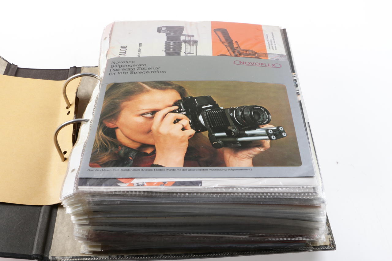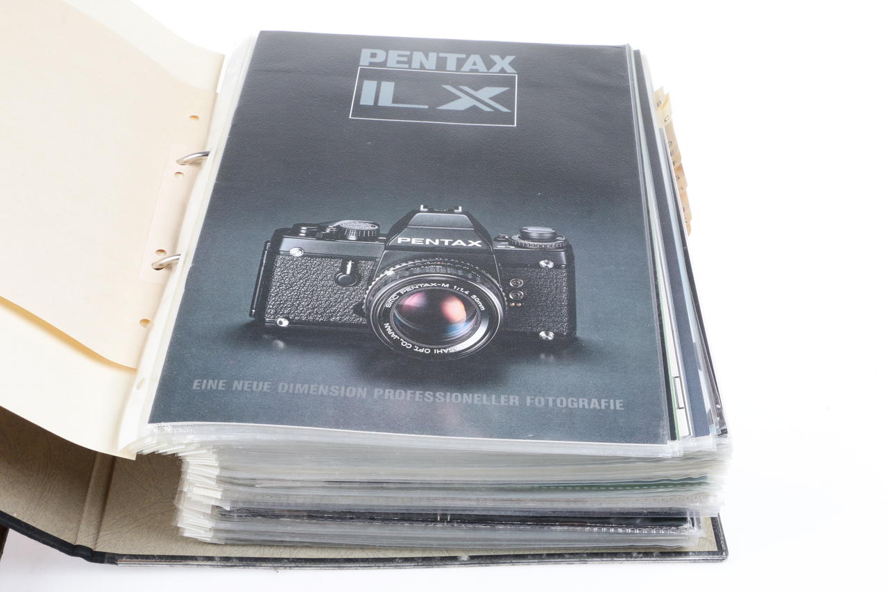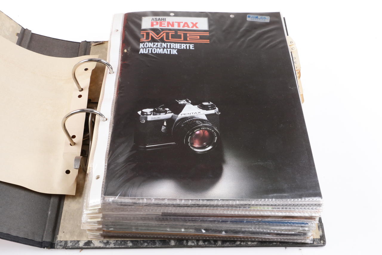 5x folders with various camera and lens brochures