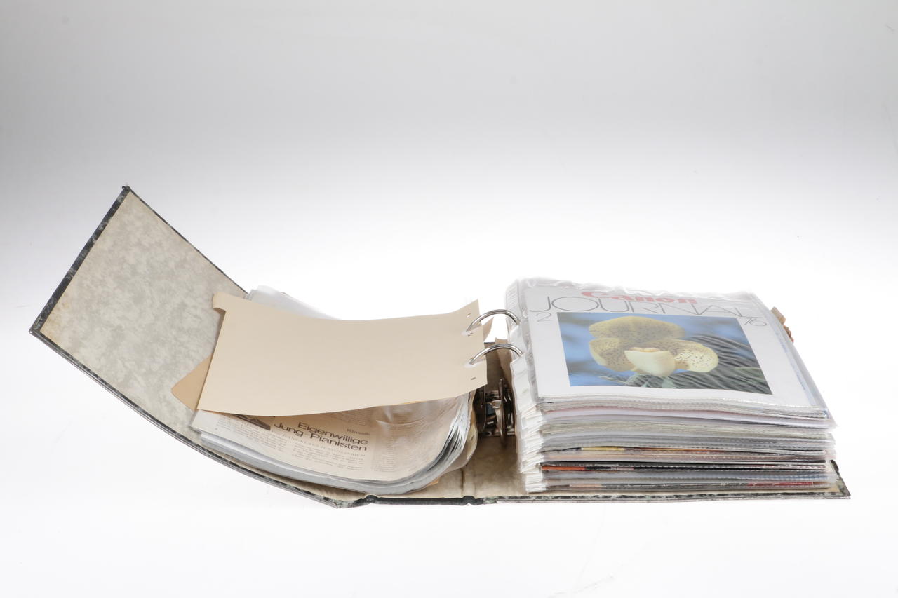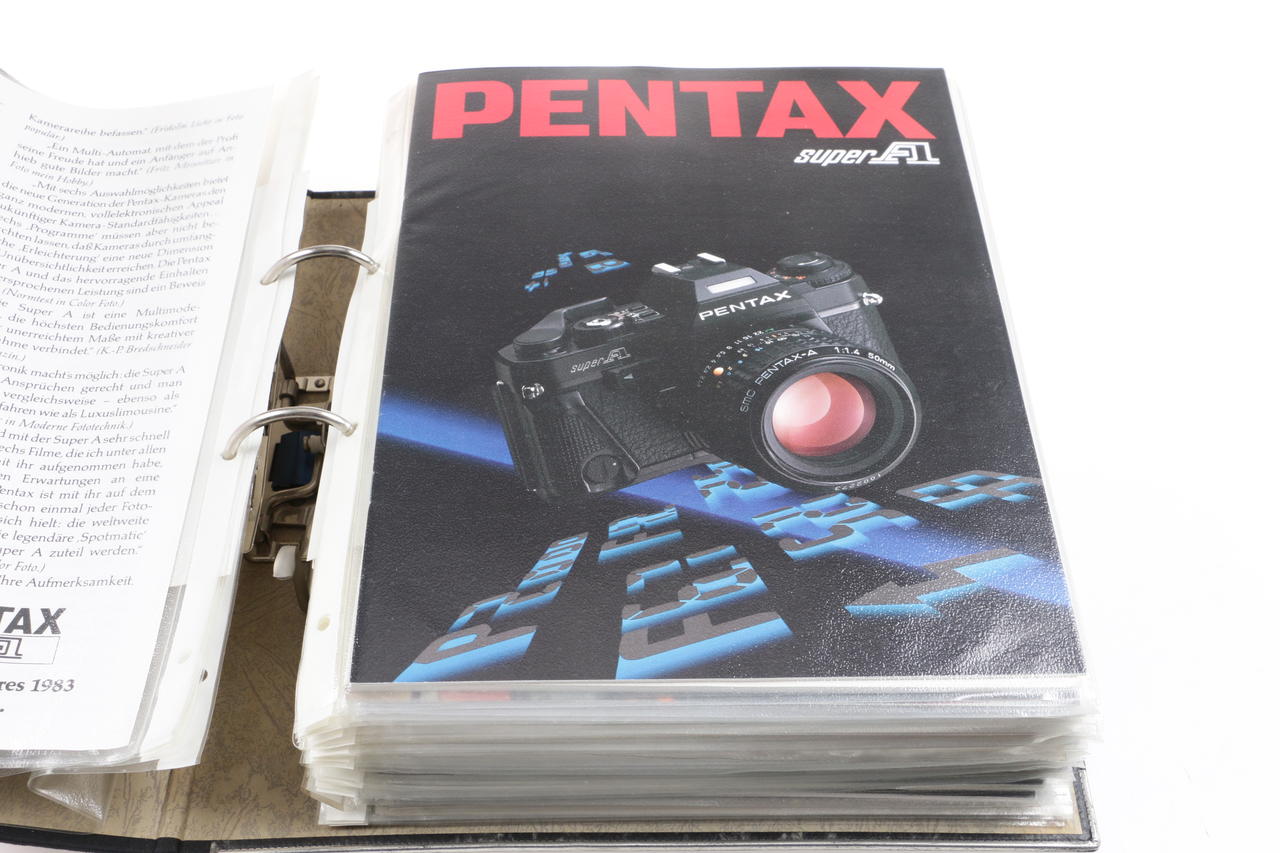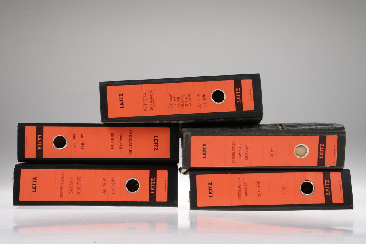 5x folders with various camera and lens brochures
