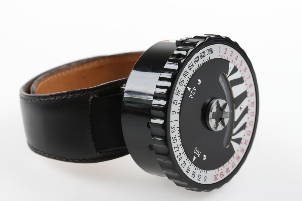 Leather strap with mounting disc for transport wheel with light meter