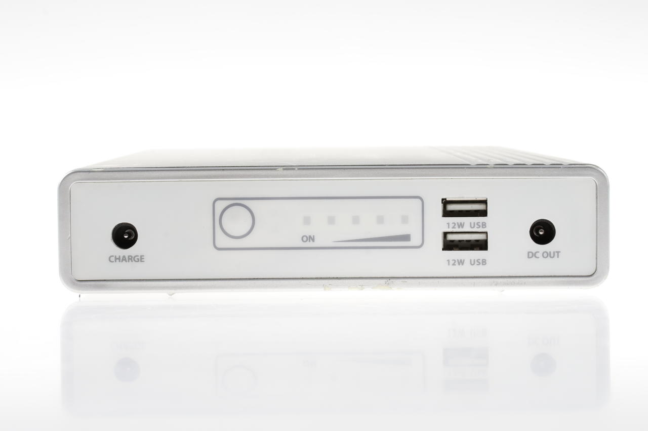 Among other things, it offers a DC output of 14.5-18.5 V (depending on the configuration) and USB outputs for parallel charging of USB devices. The housing is made of aluminium and has short-circuit, overcharge and temperature protection. Size approx. 25.6 × 15 × 3.4 cm and weight approx. 2.1 kg.
