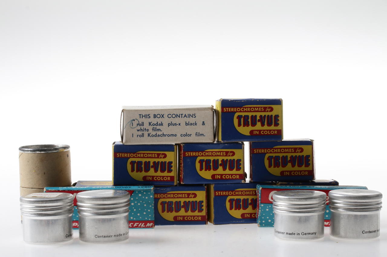 Collection of various vintage films, film reels and packaging,
