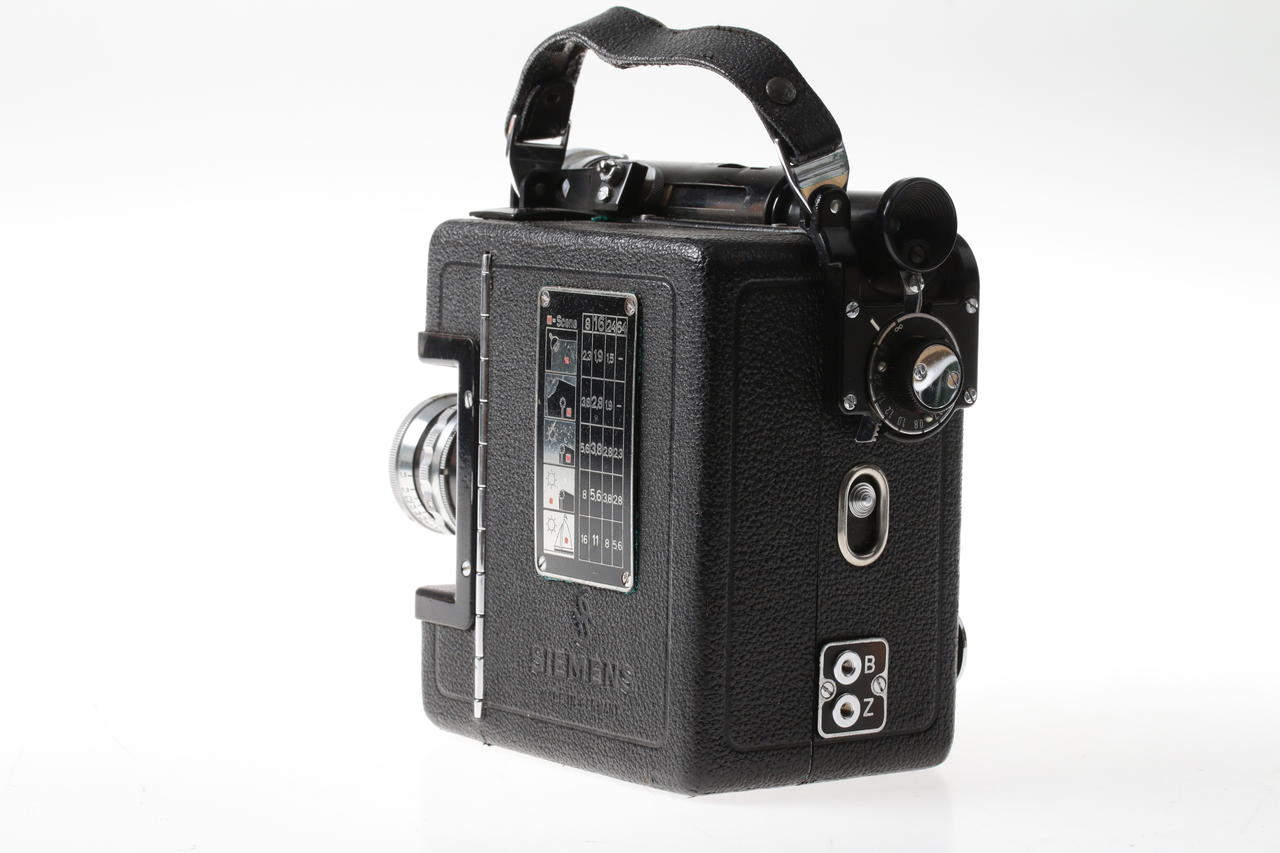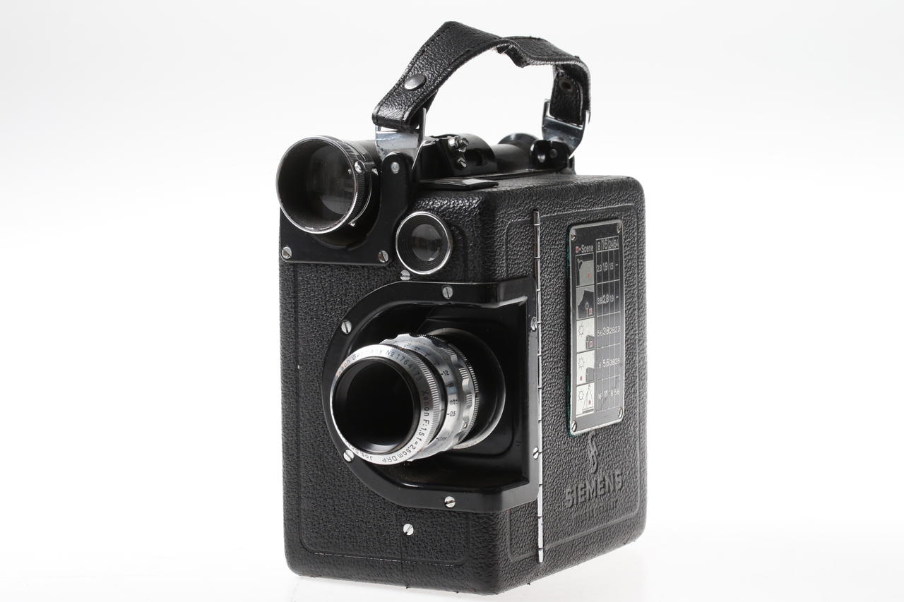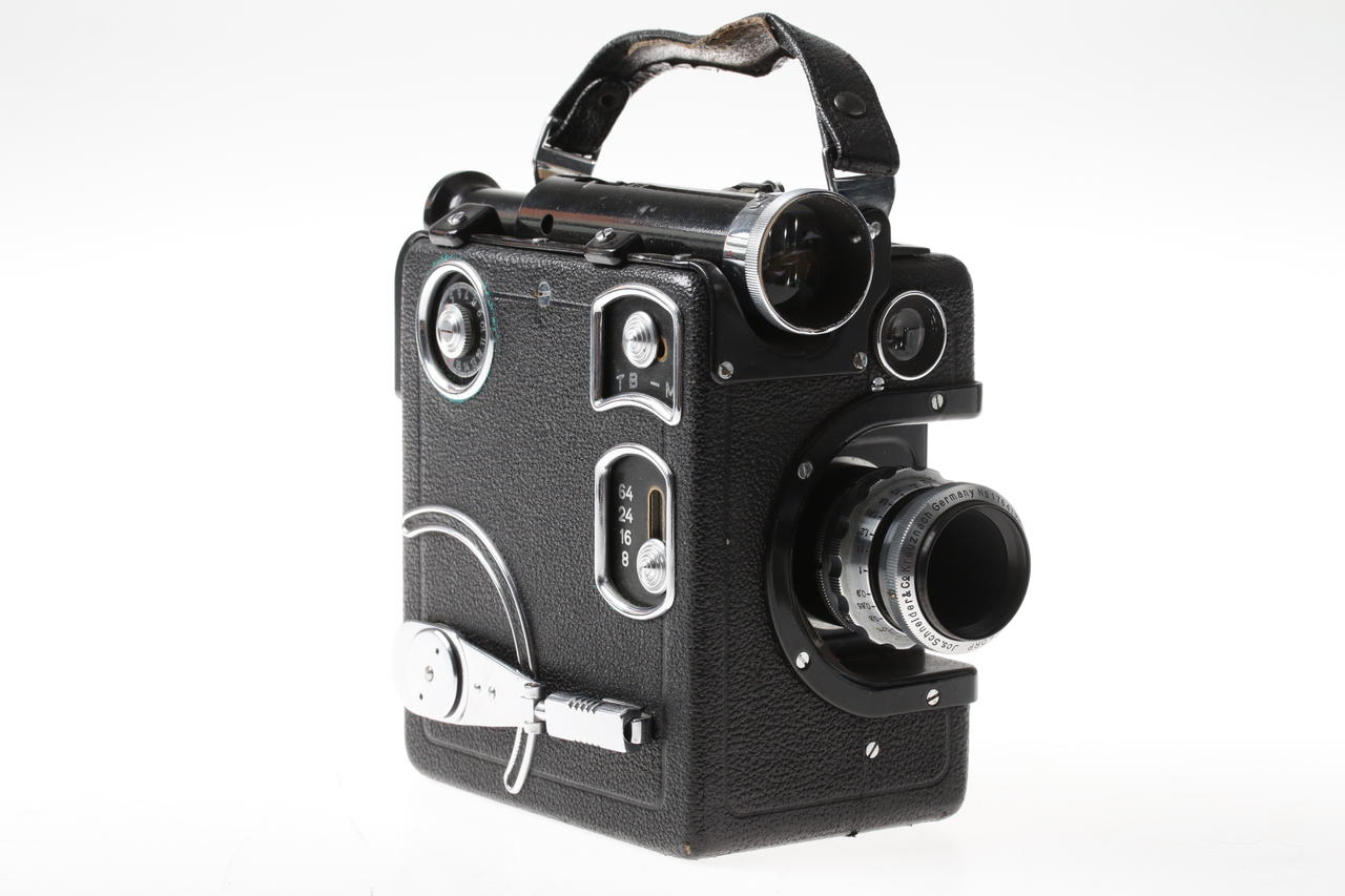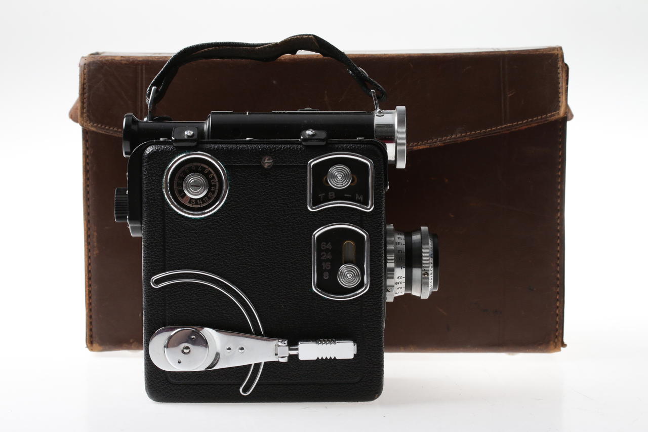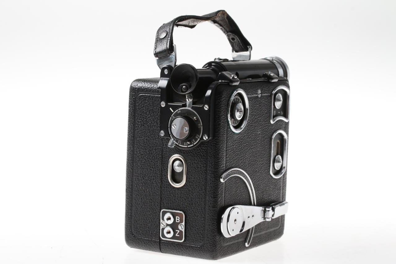 Mechanical 16mm film camera with metal housing and spring mechanism, manufactured in the 1930s