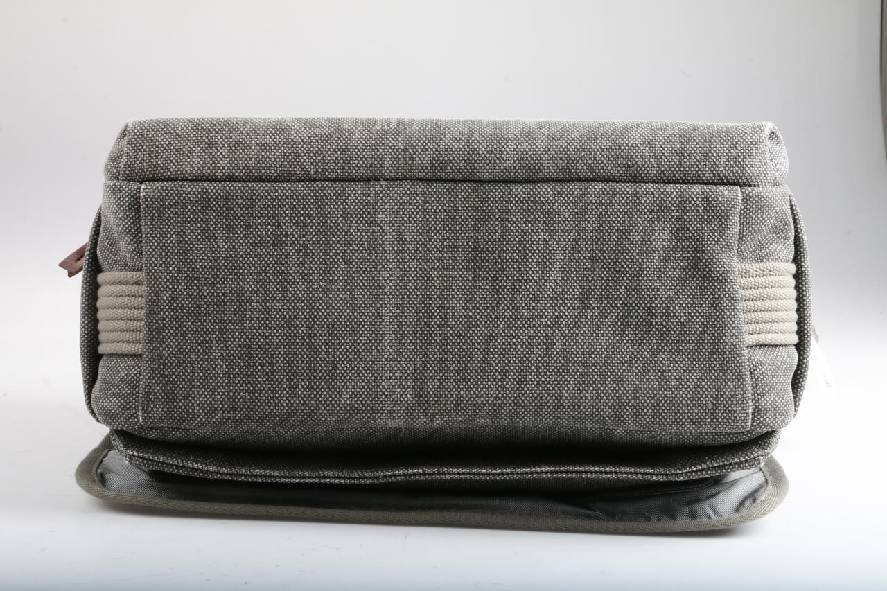 Cotton canvas with DWR coating, PU backing, leather trim