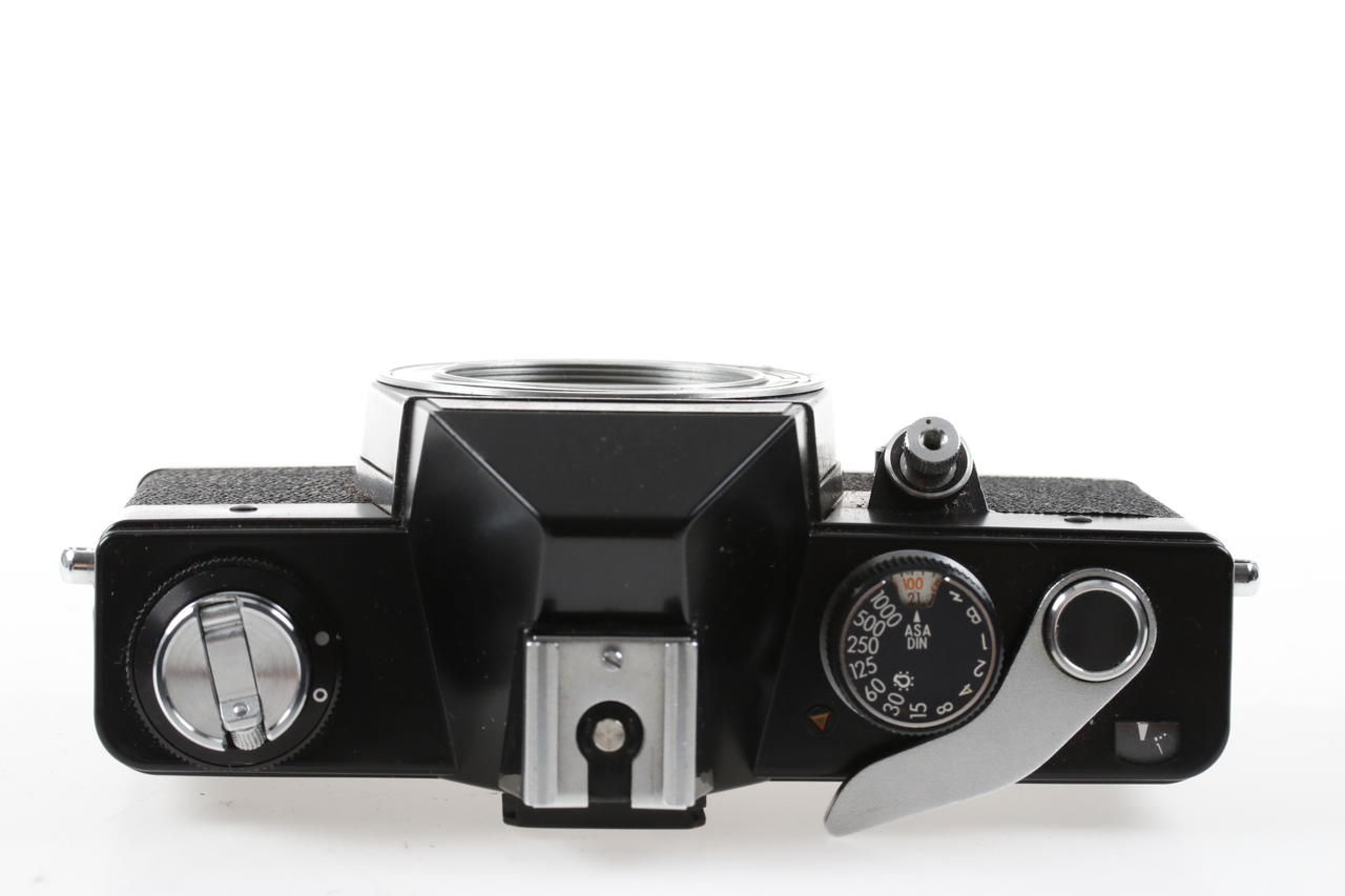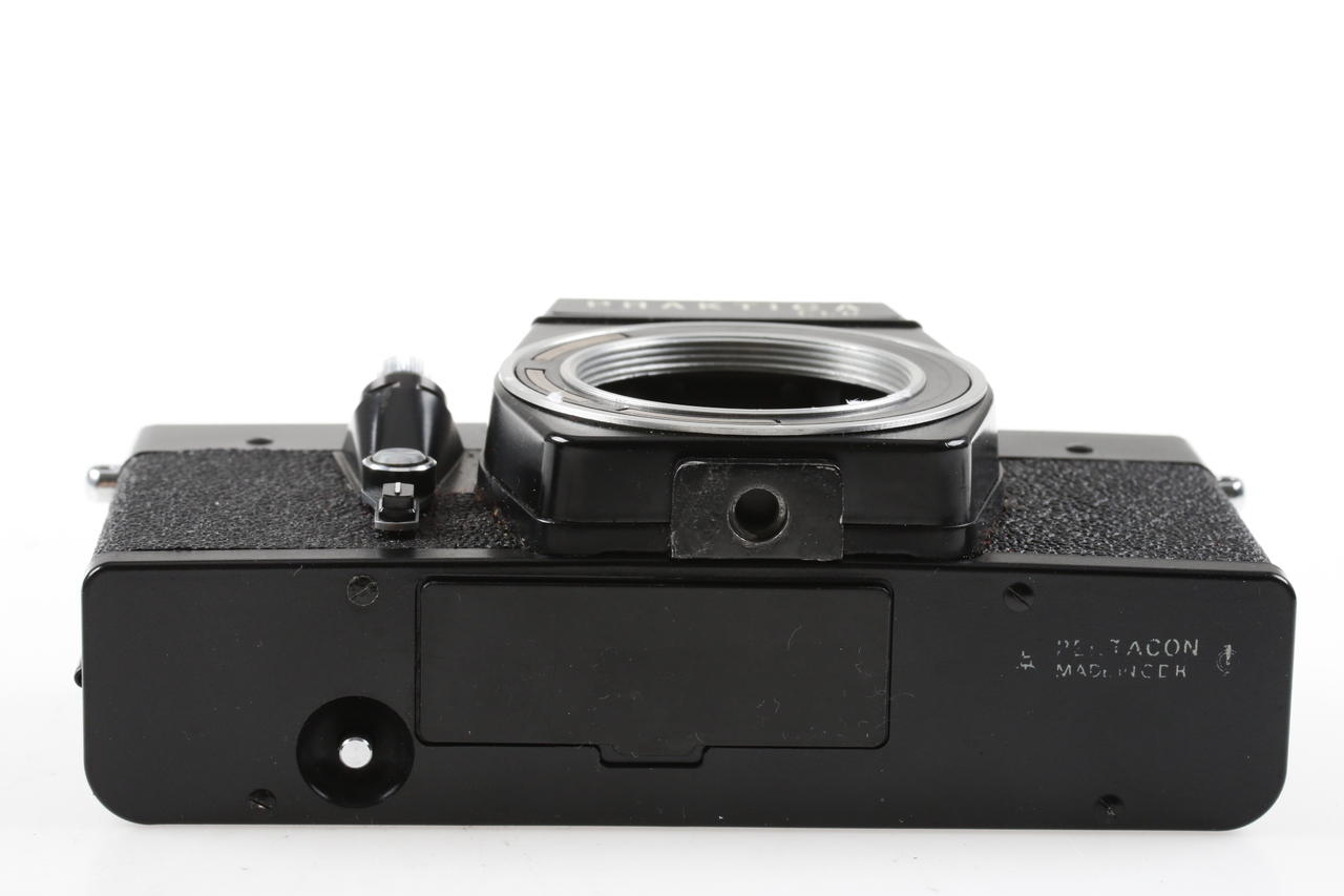 Nähere Angaben zum Zustand: Belichtungsmesser defekt, Gebrauchsspuren auf der Bodenplatte, Lackabschürfungen, lange Zeiten laufen nicht richtig, leichte Staubeinschlüsse, mittlere Gebrauchsspuren, Staubeinschlüsse im Sucher